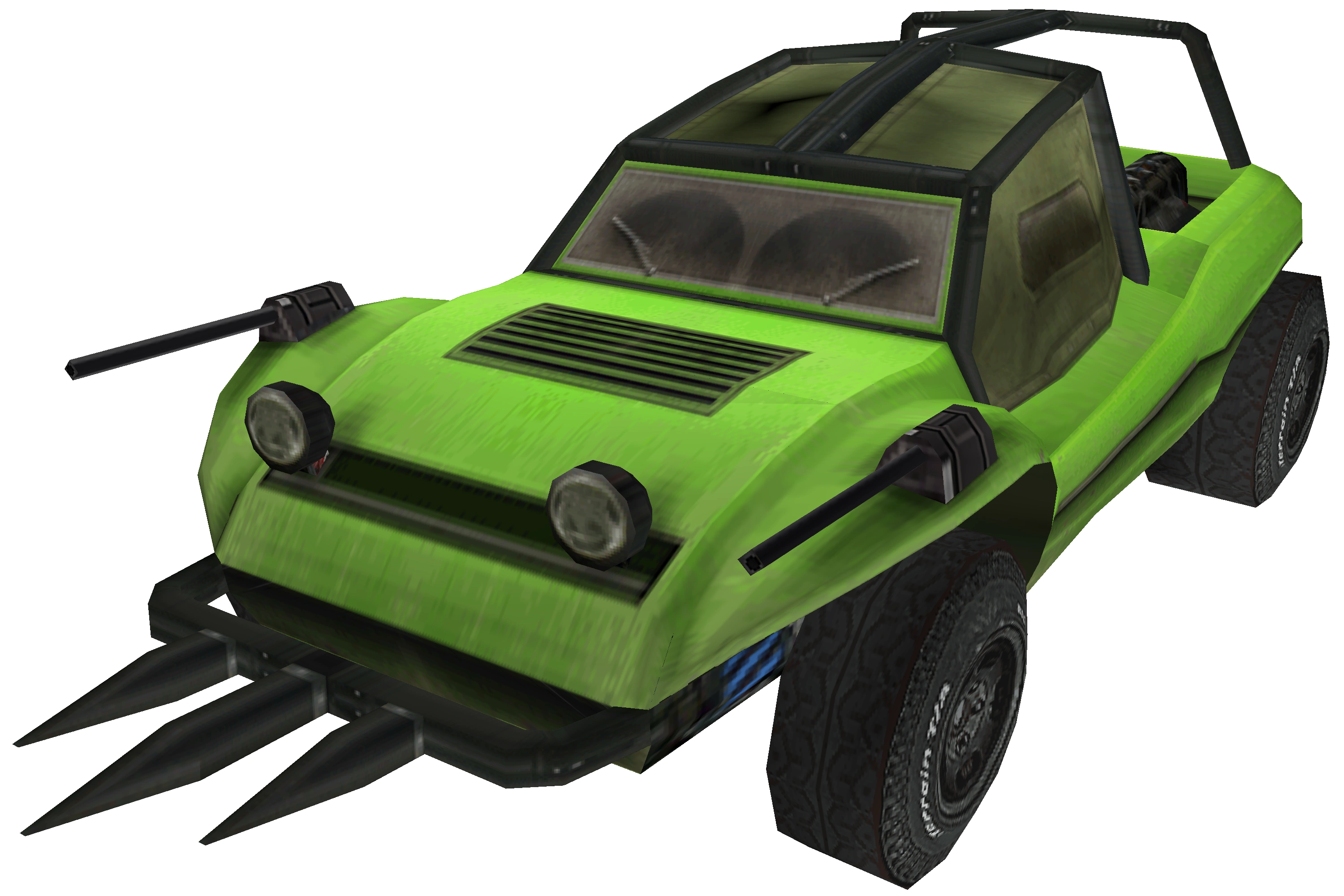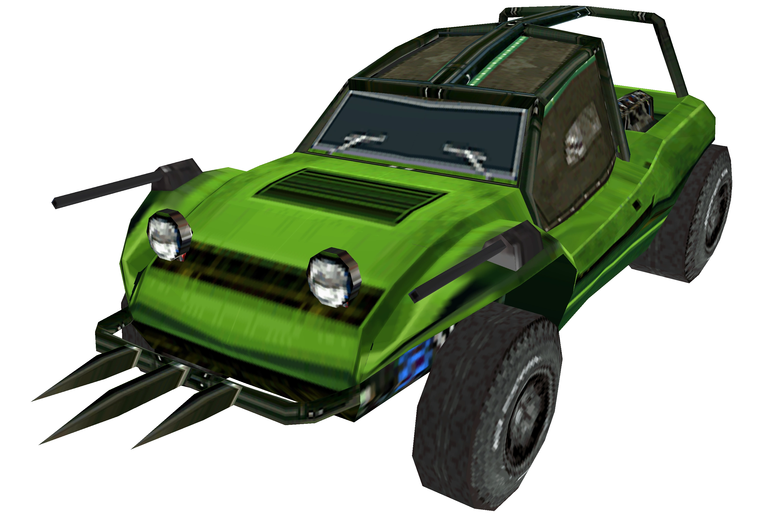 It resembles a green Meyers Manx. It has three spikes attached to the front.