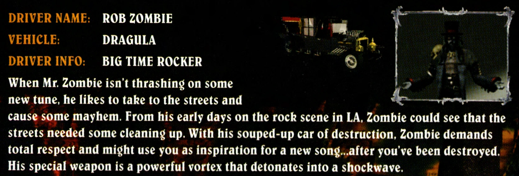Rob Zombie, also known as Mr. Zombie, is a character from Twisted Metal 4. He drives the Dragula, and he is the first and only character in the Twisted Metal series that is a guest, with Rob Zombie being a real-life music star.