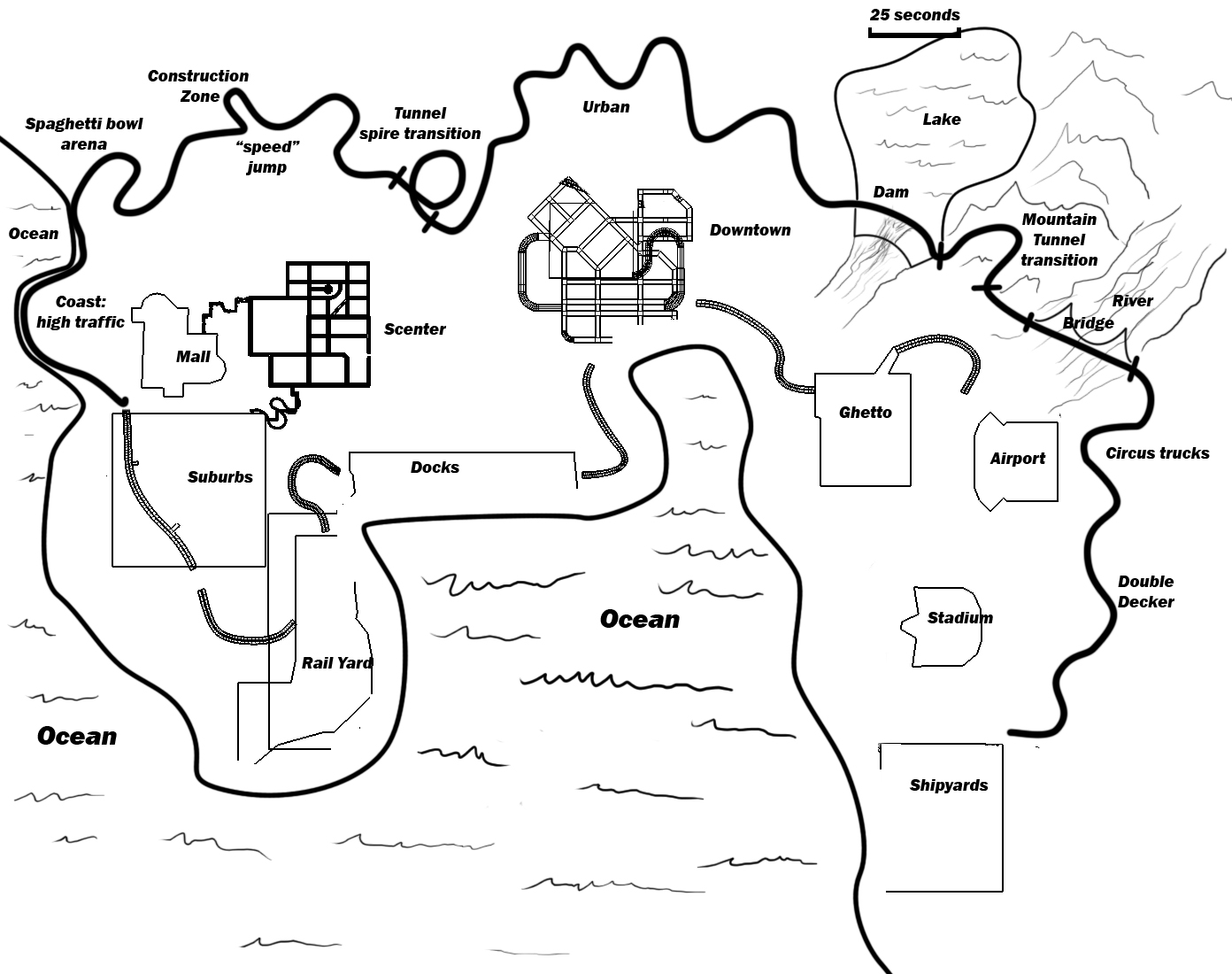 The third one, dated October 8th 2004, details the different sections of the Freeway. In the latest build from August 11th 2005, the Freeway level's file date is from October 14th 2004, indicating that it wasn't worked on much at all after this map plan.