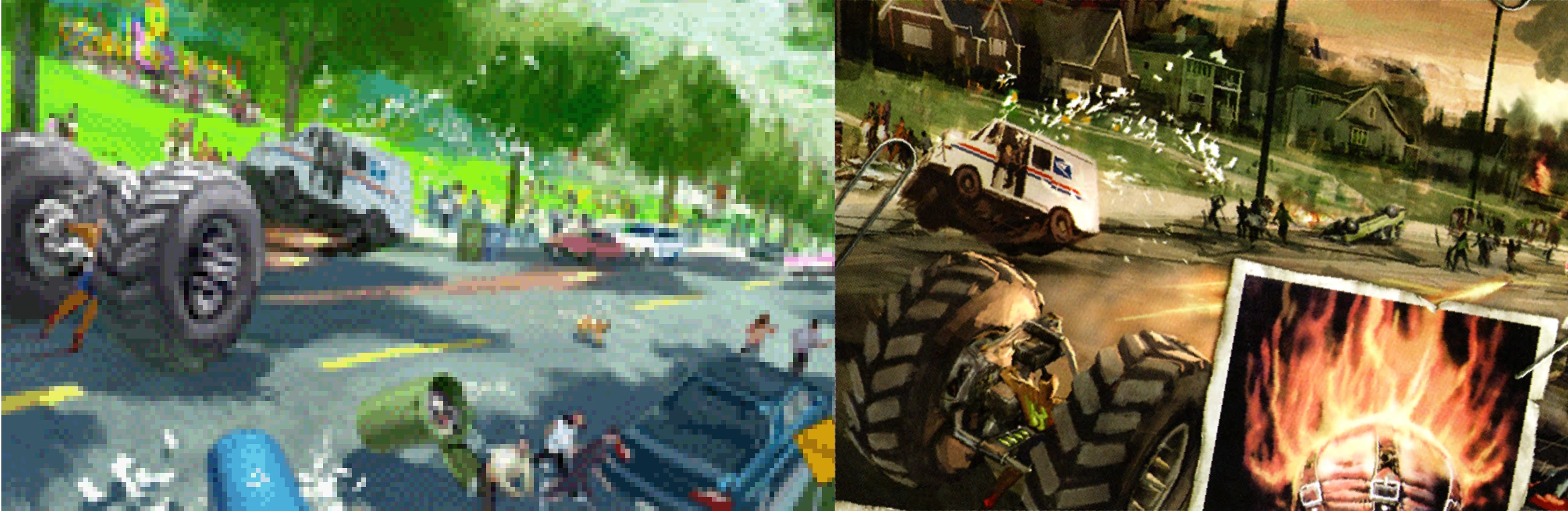 The newer models created for the game were more colorful and much less detailed than the cars from Black, having lower resolution textures, and a much lower poly count. These newer models were seemingly created with the earlier "Battle In Your Own Backyard" concept. Most of these older, less detailed designs would soon be reused for their PlayStation Portable project: Twisted Metal: Head-On, when the development of that game started.
